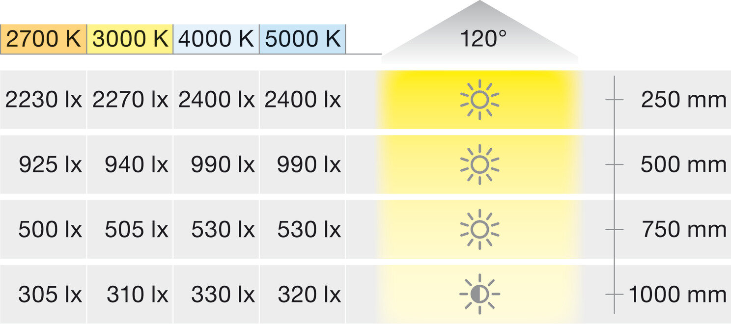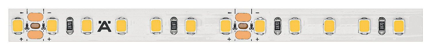 Upozornenie: bezprostredne nadväzujúca časť pásky s novým napájacím zdrojom je zreteľne svetlejšia. Maximálna dĺžka pásky závisí od výkonu drivera – pozri Technické údaje pre LED osvetľovacie pásky.