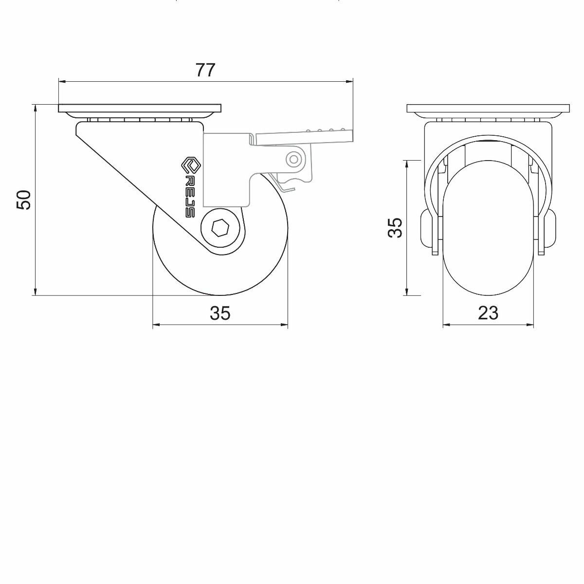 35 mm otočné nábytkové koliesko bez brzdy. Plášte kolies sú vyrobené z kvalitného materiálu, ktorý nepoškodzuje povrch podláh a otočná, nosná oceľová konštrukcia poskytuje nosnosť 30 kilogramov.