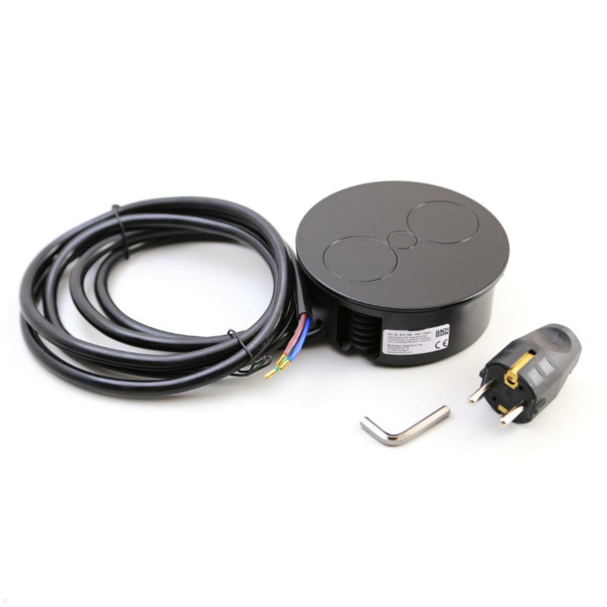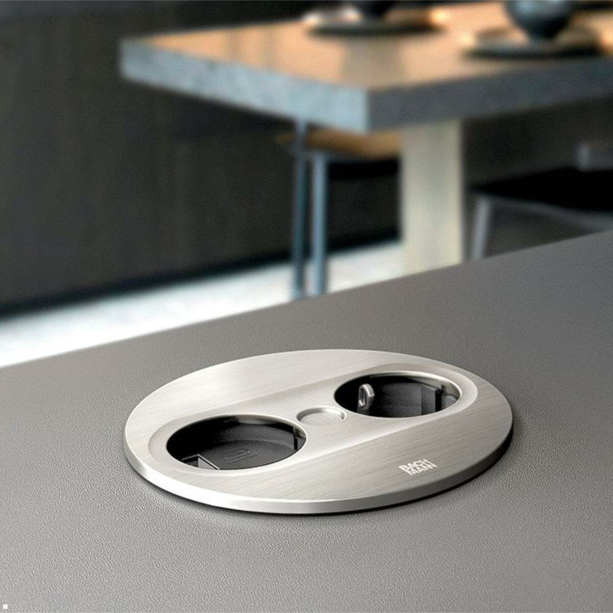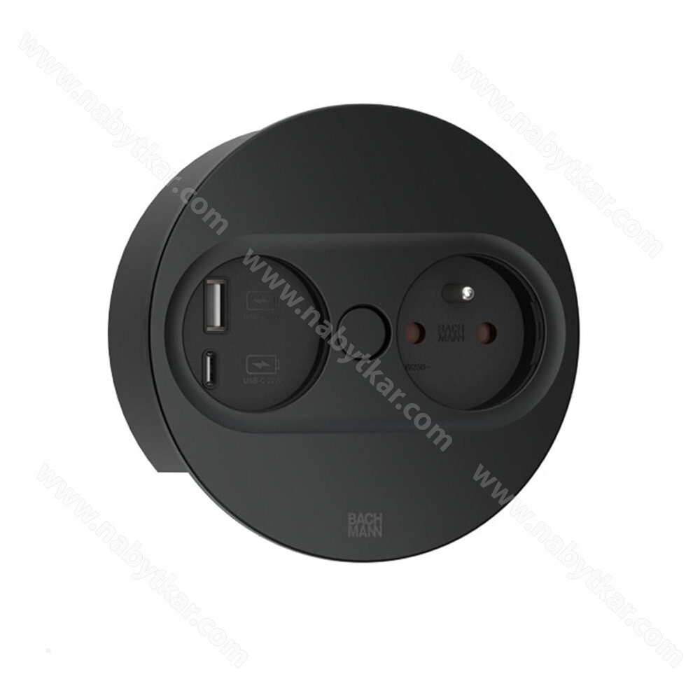 Čierna Bachmann TWIST 2 so zásuvkou UTE a A/C nabíjačkou, France 946.106 je okrúhla vstavaná zásuvka do kancelárie, obývačky alebo kuchyne vo francúzskej elektrickej sieti. Vďaka kompaktnému dizajnu a nízkej inštalačnej hĺbke je integrovaná do pracovných stolov alebo kuchynských dosiek, aby sa ušetrilo miesto. Elektrické vedenie je vedené blízko krytu, takže hĺbka inštalácie je len cca. 40 mm - montáž nad zásuvkami je teda možná bez problémov.